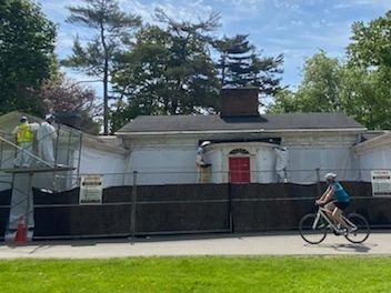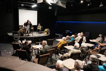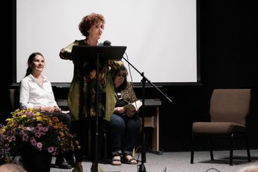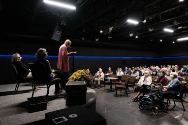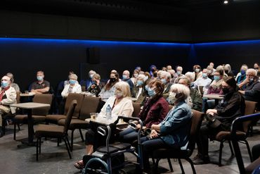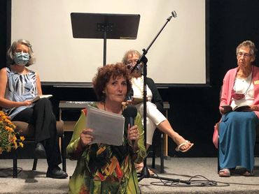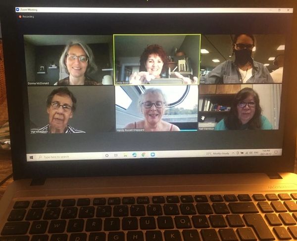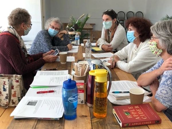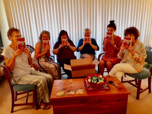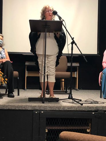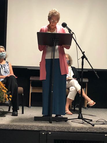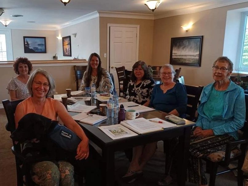 July 22, 2021. We finally come together again, in-person, at the Burke's Funeral Home meeting room. All double- vaccinated, we have a chance to greet each other with hugs, and to read our new stories aloud. Scarlett, a service dog-in-training, joins us.